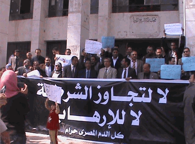 ورفع المشاركون لافتات “لا لتجاوزات الشرطة و لا للارهاب” ، فيه تأكيد منهم على رفض ممارسات الشرطة فى التعامل مع المحامين والمواطنين بشكلٍ عام ، خاصة بعد انكشاف العديد من الوقائع التى تظهر استهانة الجهات الامنية بحياة المواطنين .