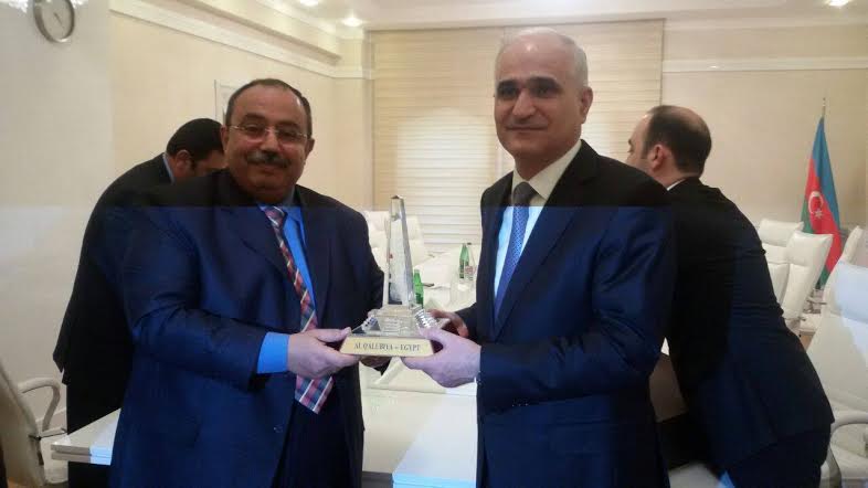 كرم شاهين مصطفي وزير الإقتصاد والصناعة بأزربيجان المهندس محمد عبد الظاهر محافظ القليوبية خلال زيارته لدولة أزر بيجان بحضور هيثم جلال سفير مصر هناك.