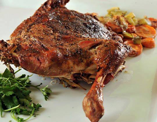 – يوضع الكتف المحشو فوق الخضروات، ويُدعك بقليل من الزيت.