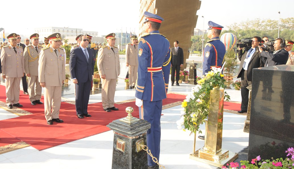 يأتى الخطاب بعد ساعات من وضع الرئيس إكليلًا من الزهور على قبر الجندى المجهول، وإكليلًا آخر على قبر الرئيس الراحل محمد أنور السادات فى مدينة نصر، بحضور كبار قادة القوات المسلحة المصرية، منهم الفريق أول صدقى صبحى وزير الدفاع، ورئيس الأركان الفريق محمود حجازى. كما حضر شيخ الأزهر الدكتور أحمد الطيب، واللواء مجدى عبد الغفار وزير الداخلية.