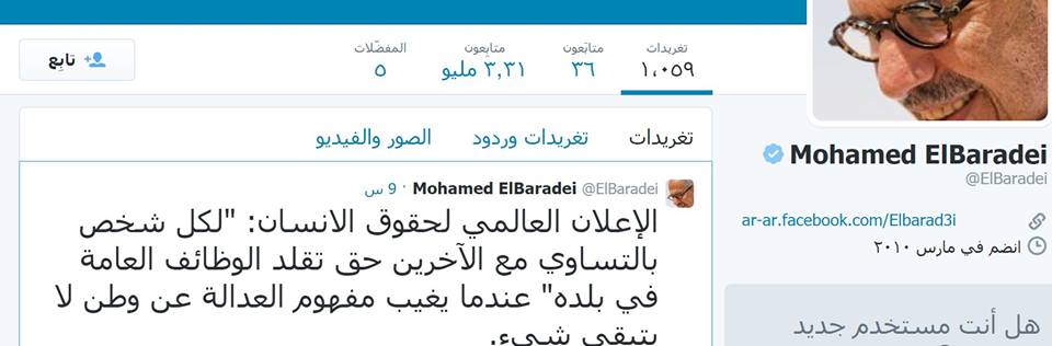 وقال البرادعي في تغريدة على صفحته الرسمية على تويتر :” الإعلان العالمى لحقوق الإنسان: “لكل شخص بالتساوى مع الآخرين حق تقلد الوظائف العامة فى بلده.. عندما يغيب مفهوم العدالة عن وطن لا يتبقى شىء”.