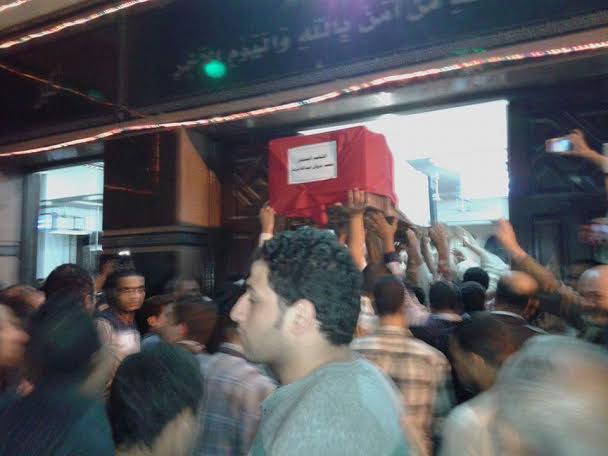 وخرج الجثمان  ملفوفا بعلم مصر من  المسجد الكبير  بالمدينة  فى جنازة  حاشدة  يتقدمها مأمور مركز شرطة شبين القناطر  لتوديعه إلى مثواة الأخير  وسيطرت حالة من الحزن الشديد والذهول على المشيعين الذين رددوا الهتافات المنددة بالارهاب الذى يغتال أرواح الأبرياء مطالبين بالقصاص العاجل  والناجز من الجناة.