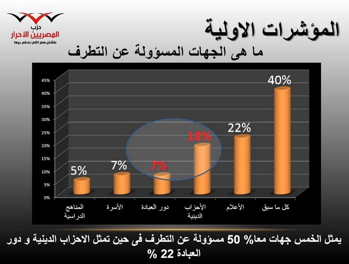 وحول الجهات المسؤولة عن التطرف، جاءت الأحزاب الدينية ودور العبادة بنسبة 25% من عدد المشاركين، ثم الإعلام والأسرة والمناهج الدراسية.