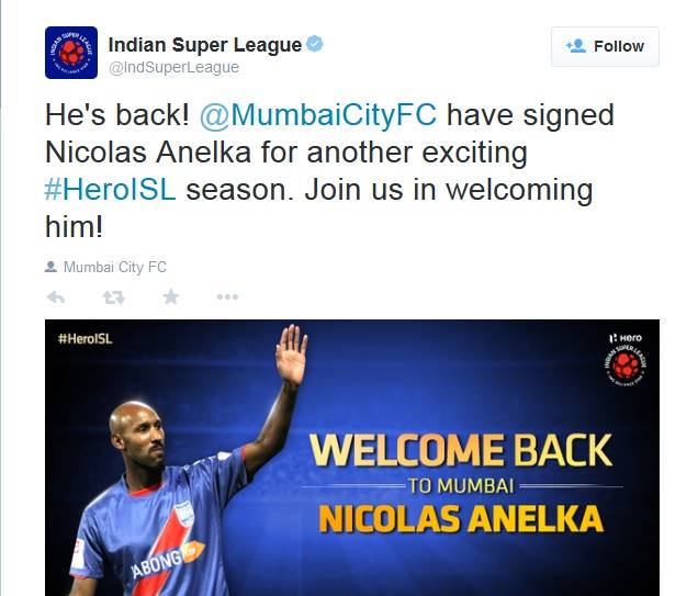 وأعلن نادى مومباى نبأ عودة مهاجم منتخب الديوك السابق والذى احترف فى صفوف كبرى الأندية العالمية (باريس سان جيرمان، الأرسنال، ريال مدريد، ليفربول، مانشستر سيتى، فناربخشه وتشيلسى) عبر موقع النادى الرسمى على تويتر