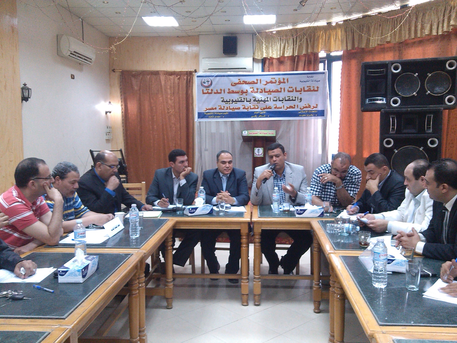 نظمت نقابات وسط الدلتا اليوم الخميس مؤتمرا بمقر نقابة الصيادلة بالقليوبية لإعلان رفض فرض الحراسة القضائية على النقابة بحضور 4 نقباء لمحافظات القليوبية و المنوفية والغربية وكفرالشيخ وممثلين عن النقابة العامة واعضاء مجلس النقابة الفرعية بالقليوبية.