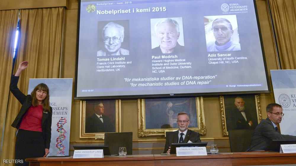 أعلنت الأكاديمية الملكية السويدية للعلوم، الأربعاء، منح جائزة نوبل للكيمياء إلى السويدي توماس ليندال والأميركي بول مودريش والأميركي من أصل تركي عزيز سنجر.