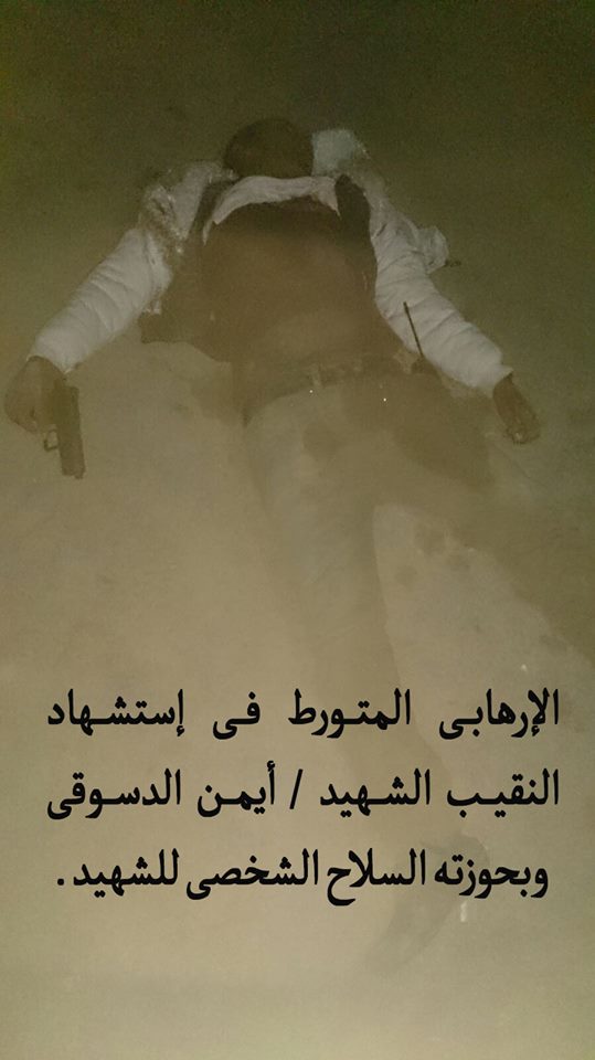 وبتفتيش القتيل تبين تورطه فى واقعة إستشهاد نقيب الشرطة الشهيد / أيمن الدسوقى يوم 13 / 1 / 2015 وعثر بحوزته على السلاح الشخصى للشهيد – طبنجة 9 مم – ومبالغ مالية وجهاز لاسلكى خاص بالعناصر التكفيرية .