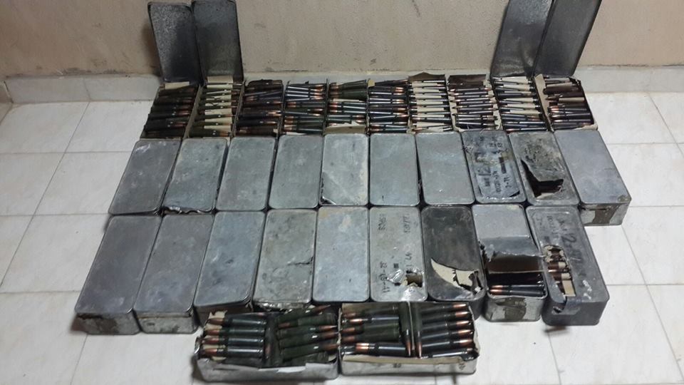 وتم العثور بداخل المخزن على عدد (32) شيكارة من مادة TNT شديدة الإنفجار ( فى صورتها الأولية ) بإجمالى وزن (1,5) طن وعدد (2465) طلقة عيار نصف بوصة وعدد (92) طلقة عيار (14,5مم ) وعدد (2000) لتر بنزين .. بالإضافة إلى عدد (2) عربة ربع نقل خاصة العناصر الإرهابية.