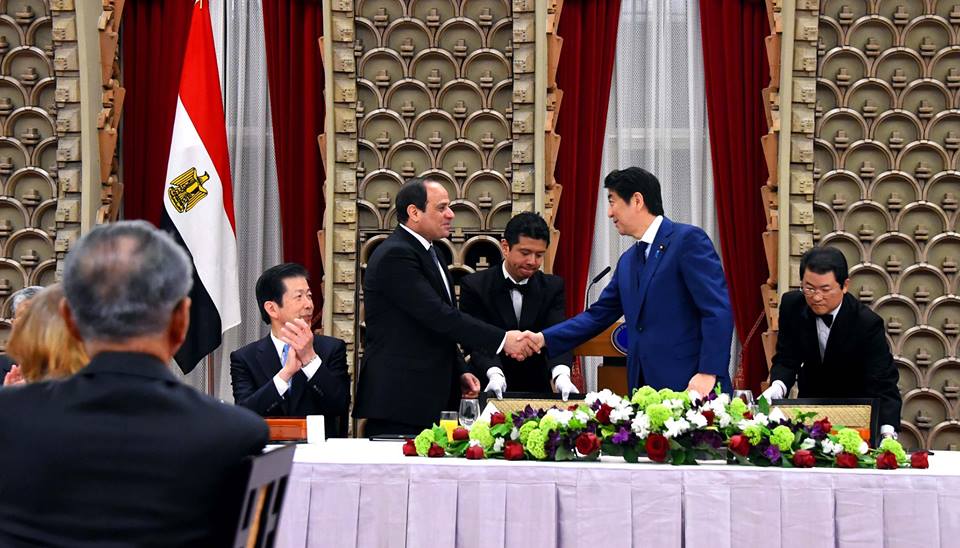 وصرح السفير علاء يوسف المتحدث الرسمي باِسم رئاسة الجمهورية بأنه تم عقد جلسة مباحثات موسعة بين الرئيس السيسي, ورئيس وزراء اليابان بحضور وفدي البلدين، حيث رحب رئيس الوزراء الياباني بالرئيس في زيارته الأولى لليابان والتي تعطي قوة دفع جديدة للعلاقات الممتدة بين البلدين، مشيداً بكلمة السيد الرئيس في البرلمان الياباني صباح اليوم، ومنوهاً إلى أنها عكست مدى تقدير مصر لليابان، وتركت في نفوس أبناء اليابان أطيب الأثر. وأشار رئيس الوزراء الياباني إلى أن بلاده تولي لعلاقاتها مع مصر اهتماماً كبيراً، سواء على الصعيد الثنائي أو الاقليمي، باعتبارها محوراً للاستقرار في منطقة الشرق الأوسط، ومنوهاً إلى أن زيارة السيد الرئيس تمثل فرصة طيبة لتبادل وجهات النظر حول سبل تنمية وتطوير العلاقات الثنائية، وتعزيز التنسيق في المحافل الدولية.