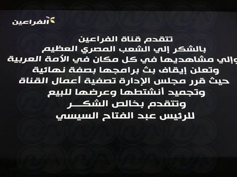 عقب اسقاط عضوية عكاشة… الفراعيين توقف البث وتعلن تجميد أنشطتها وعرضها للبيع 2 مارس، 2016 150 زيارة أوقف قناة الفراعيين ارسالها منذ قليل, وأعلنت أن مجلس ادارة القناة قد قرر تجميد أنشطة القناة, وعرضها للبيع, مقدمة الشكر للرئيس عبدالفتاح السيسي. يأتي ذلك عقب موافقة مجلس النواب علي اسقاط عضوية مالكها توفيق عكاشة.