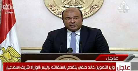 أعلن الدكتور خالد حنفي وزير التموين انه تقدم باستقالته رسميا للمهندس شريف اسماعيل رئيس الوزراء, وذلك بعد الآزمات التي أثيرت حول الوزير مؤحرا وقضية ممارسة عمله من خلال الاقامة بفندق 5نجوم.