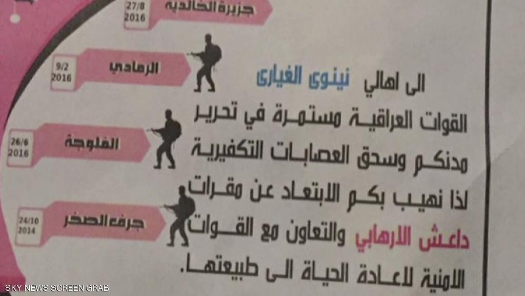 ودعت تلك المنشورات السكان إلى الابتعاد عن مقرات التنظيم الإرهابي، والتعاون مع القوات الأمنية العراقية.