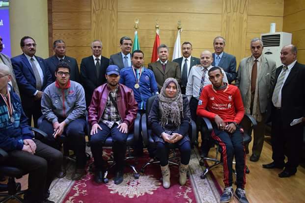 وكان الطلاب الحاصلين على المراكز الثلاثة الأولى فى بطولة الجامعات المصرية لمتحدى الإعاقة وهم الطلاب (أحمد ربيع إبراهيم الحاصل على الميدالية البرونزية فى الوثب الطويل ومصطفى إبراهيم حافظ الحاصل على الميدالية البرونزية فى رمى الجله ومصطفى عبد الغنى حاصل على الميدالية الفضية فى تنس الطاولة جلوس وخالد ممدوح عرفه الحاصل على الميدالية الفضية فى رمى القرص وأحمد الشافعى الحاصل على الميدالية الذهبية فى رمى الجله والسيد عبد الخالق الحاصل على الميدالية الذهبية فى رمى الجله وحسان حفنى الحاصل على الميدالية الذهبية فى تنس الطاولة جلوس وزينب عبد السلام الحاصلة على الميدالية الذهبية فى تنس الطاولة جلوس وعمرو إبراهيم الحاصل على الميدالية الذهبية فى رمى الجله).