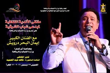 تحت رعاية وزير الشباب والرياضة خالد عبدالعزيز. تستضيف الناقدة الدكتورة ناهد عبد الحميد رئيس الصالون الثقافي, عضو المجلس القومي للمرأة, الفنان إيمان البحر درويش بملتقى شباب المبدعين، بمصاحبة أوركسترا وزارة الشباب والرياضة بقيادة المايسترو عز الدين، وذلك في الثانية عشر ظهر غدا الخميس، على مسرح وزارة الشباب والرياضة.