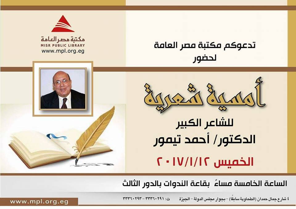 تستضيف مكتبة مصر العامة في الخامسة من مساء اليوم الخميس, الآمسية الشعرية للشاعر الكبير الدكتور أحمد تيمور, بحضور عدد كبير من الفنانين والمثقفين.