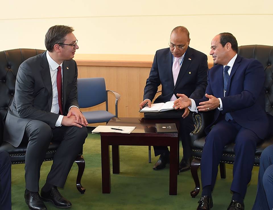 وصرح السفير علاء يوسف المتحدث الرسمي باِسم رئاسة الجمهورية بأن الرئيس السيسي استهل اللقاء بتوجيه التهنئة لرئيس صربيا بمناسبة فوزه في الانتخابات الرئاسية وتوليه منصبه الجديد في شهر أبريل الماضي، معرباً عن التطلع للتعاون معه خلال الفترة القادمة من أجل العمل على تعزيز العلاقات المتميزة والتاريخية التي تجمع بين البلدين. وأشار السيد الرئيس إلى اهتمام مصر بتطوير التعاون الثنائي بين البلدين في مختلف المجالات، ولاسيما على المستويين الاقتصادي والتجاري، مشيراً إلى أهمية عقد اللجنة المشتركة للتعاون الاقتصادي والعلمي والفني في أقرب فرصة من أجل استكشاف سبل تعزيز التعاون بين البلدين في القطاعات المختلفة.