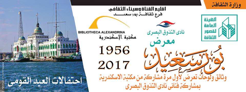 اليوم السبت الموافق 23 ديسمبر ،وفى اطار احتفالات محافظة بورسعيد بالعيد القومى تقيم الهيئة العامة لقصور الثقافة – اقليم القناة وسيناء الثقافى – فرع ثقافة بورسعيد – نادى التذوق البصرى بالاشتراك مع مكتبة الاسكندرية ، معرضاً للتصوير الفوتوغرافى والفن التشكيلى بعنوان (بورسعيد 1956-2017) وتساهم مكتبة الاسكندرية ولأول مرة بمخطوطات وصور ووثائق لبورسعيد.