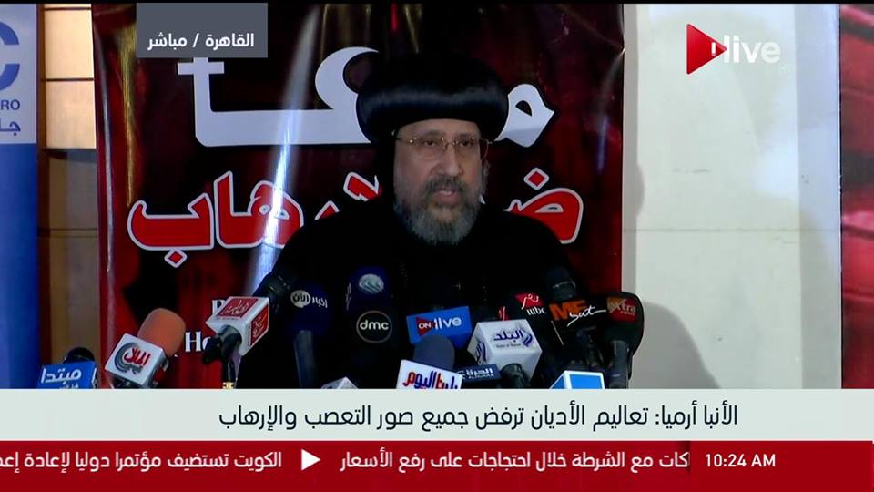 أكد الأنبا أرميا، الأسقف العام رئيس المجلس الثقافى الأرثوذوكسى، عضو مجلس أمناء المنتدي المصري للاعلام, أن المواجهة الفكرية للأفكار المغلوطة التى تستحل الدماء هي أولي الخطوات لمواجهة لارهاب, بالتعاون بين الأزهر والكنيسة, اضافة الي العمل علي غرس مفاهيم العدل والرحمة والسلام وأهميتهم فى بناء المجتمع، والعمل معا على إقرار السلام ونزع فتيل الإرهاب
