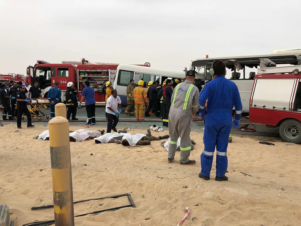 وكانت الإدارة العامة للإطفاء بالكويت, قد أعلنت وفاة 15 شخصاً وإصابة اثنين آخرين في حادث تصادم وقع اليوم بين حافلتين على طريق الأرتال باتجاه الوفرة, مشبرة الي أن الحافلتين اصطدمتا وجهاً لوجه ما أدى إلى وقوع هذا العدد الكبير من الضحايا.
