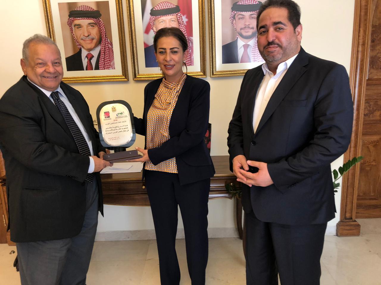ومن جانبه قدم الدكتور إبراهيم أبو ذكري لمعالي الوزيرة جومانة غنيمات درع الوفاء والتميز تكريما لها واعترافا من جميع الكوادر المتميزة والكيانات المكونة للاتحاد بثمانية عشر دولة عربية  علي مجهودها المخلص بالعمل العربي المشترك وأداءها المتميز في المجال الإعلامي بالأردن وبالعالم العربي .