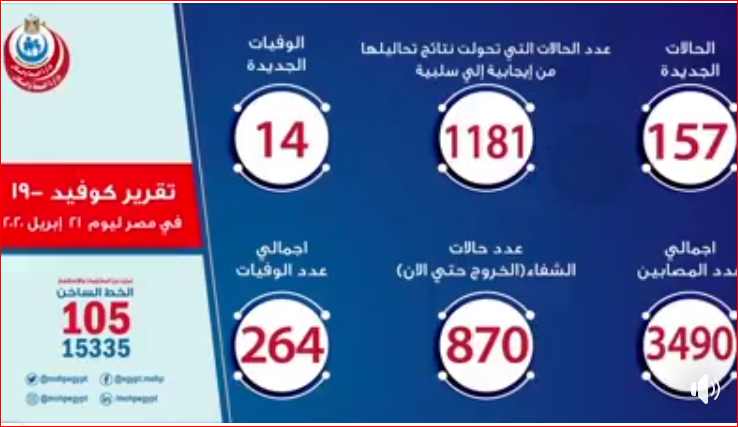وذكر “مجاهد” أن إجمالي العدد الذي تم تسجيله في مصر بفيروس كورونا المستجد حتى اليوم، الثلاثاء، هو 3490 حالة من ضمنهم 870 حالة تم شفاؤها وخرجت من مستشفيات العزل، و 264 حالة وفاة.