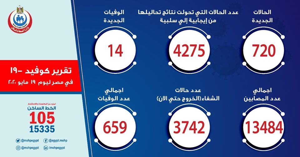 وذكر “مجاهد” أن إجمالي العدد الذي تم تسجيله في مصر بفيروس كورونا المستجد حتى اليوم، الثلاثاء، هو 13484 حالة من ضمنهم 3742 حالة تم شفاؤها وخرجت من مستشفيات العزل والحجر الصحي، و 659 حالة وفاة.