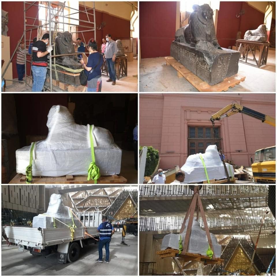 استقبل المتحف المصري الكبير بميدان الرماية ٧ قطع أثرية ضخمة قادمة من المتحف المصري بالتحرير تمهيدا لعرضها على الدرج العظيم ضمن سيناريو العرض المتحفي الخاص بالمتحف المقرر افتتاحه العام القادم.