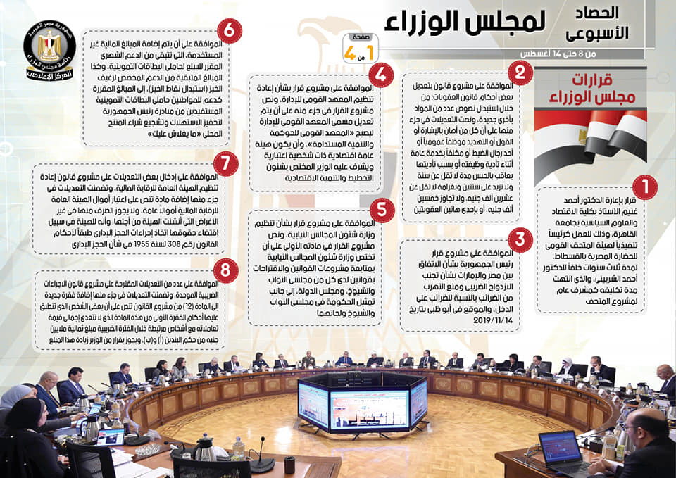 وجاء في التقرير أنه تمت الموافقة على عدد من القرارات، تشمل قراراً بإعارة الدكتور أحمد غنيم الأستاذ بكلية الاقتصاد والعلوم السياسية بجامعة القاهرة، وذلك للعمل كرئيساً تنفيذياً لهيئة المتحف القومي للحضارة المصرية بالقسطاط، لمدة ثلاث سنوات خلفاً للدكتور أحمد الشربيني، والذي انتهت مدة تكليفه كمشرف عام لمشروع المتحف، وكذلك الموافقة على مشروع قانون بتعديل بعض أحكام قانون العقوبات؛ من خلال استبدال نصوص عدد من المواد بأخرى جديدة، ونصت التعديلات في جزء منها على أن كل من أهان بالإشارة أو القول أو التهديد موظفاً عمومياً أو أحد رجال الضبط أو مُكلفاً بخدمة عامة أثناء تأدية وظيفته أو بسبب تأديتها يُعاقب بالحبس مدة لا تقل عن سنة ولا تزيد على سنتين وبغرامة لا تقل عن عشرين ألف جنيه، ولا تجاوز خمسين ألف جنيه، أو بإحدى هاتين العقوبتين، هذا بجانب الموافقة على مشروع قرار رئيس الجمهورية بشأن الاتفاق بين مصر والإمارات بشأن تجنب الازدواج الضريبي ومنع التهرب من الضرائب بالنسبة للضرائب على الدخل، والموقع فى أبو ظبي بتاريخ 14/11/2019.