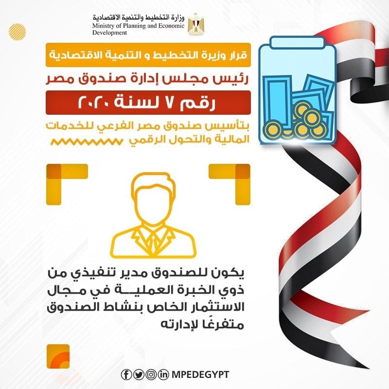 أصدرت الدكتورة هالة السعيد وزيرة التخطيط و التنمية الاقتصادية، رئيس مجلس إدارة صندوق مصر، القرار رقم 7 لسنة 2020 بتأسيس صندوق مصر الفرعي للخدمات المالية والتحول الرقمي.
