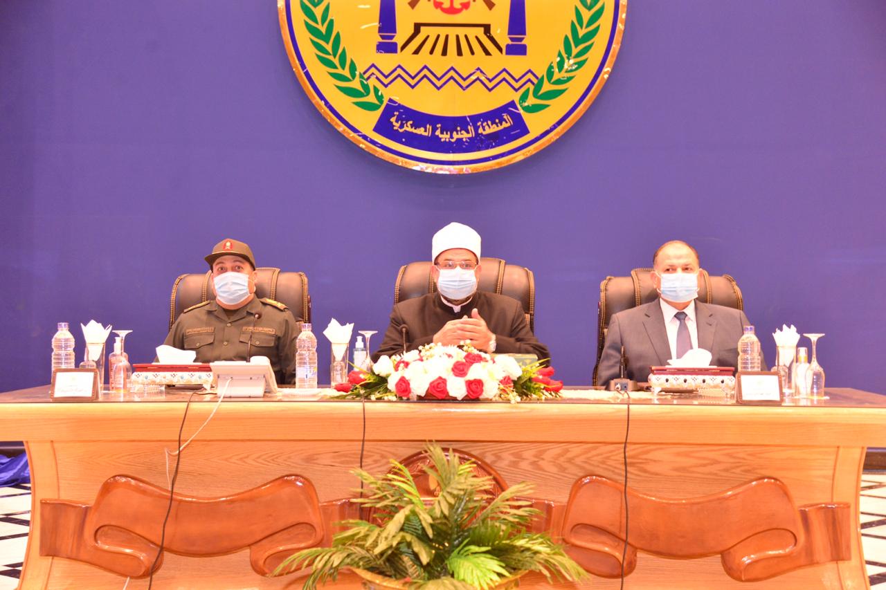 وألقى قائد المنطقة الجنوبية العسكرية كلمة رحب فيها بفضيلة الدكتور / محمد مختار جمعة وزير الأوقاف مؤكداً على حرص القيادة العامة للقوات المسلحة على التواصل الدائم مع أبنائها من الضباط وضباط الصف والجنود وكذلك الشباب من مختلف التوجهات والأعمار لخلق حالة من الوعى تجاه كافة القضايا المختلفة للدولة المصرية .