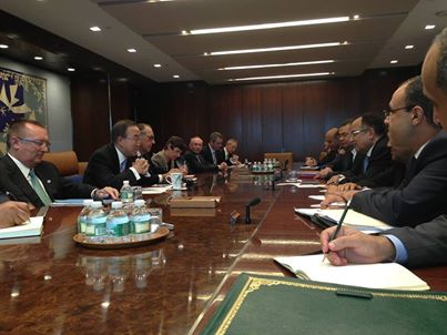 التقي وزير الخارجية “نبيل فهمي” مع سكرتير عام الأمم المتحدة “بان كي مون” علي هامش مشاركته في أعمال الدورة 68 من أعمال الجمعية العامة للأمم المتحدة، وذلك بحضور كبار مساعدي السكرتير العام ومديري الإدارات السياسية الاقتصادية المختلفة بالمنظمة الدولية.