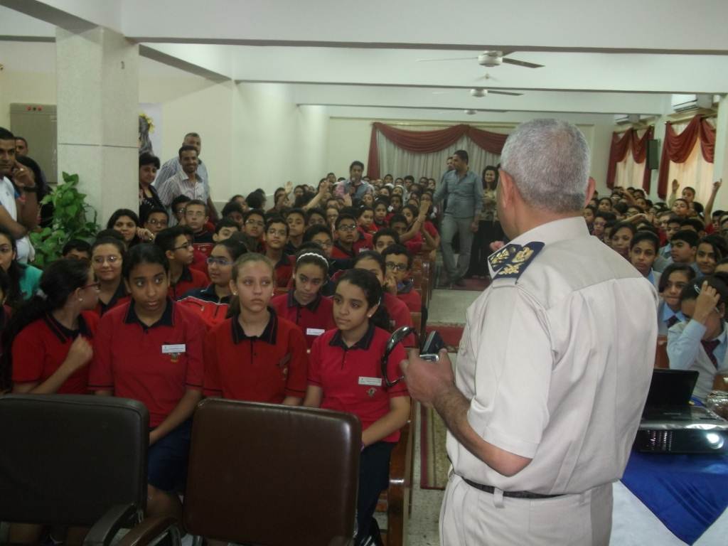 وعلي مدار ثلاثة ساعات متواصلة شرح اللواء عادل زكي مدير الإدارة العامة للمرور وفريق العمل المرافق له آليات العمل الخاصة بمنظومة المرور ومن خلال عرض عن شاشات ضخمة تم شرح مفاهيم المرور الاساسية ، والاسباب الشائعة التى تتسبب فى الحوادث على الطرق نظرا لعدم اكتراث السائقين باشارات المرور واللوحات الارشادية على الطرق ، كما اوضح ان من اسباب الحوادث هو تخطى السائقين للحارات وقام بعرض مجموعة من الافلام التسجيلية لتسهيل توصيل المعلومات للتلاميذ خاصة وانهم من طلاب المرحلتين الاعدادية والثانوية.