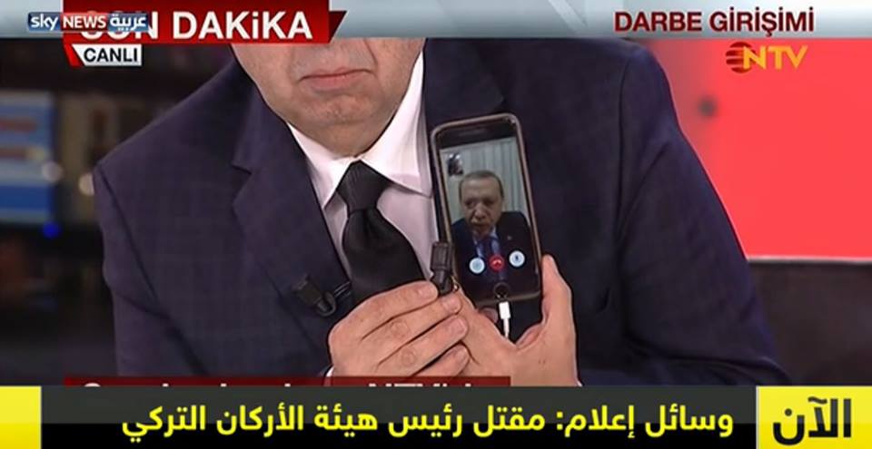 في اتصال عبر “اسكايب”, مع أحد القنوات التركية دعا الرئيس التركي الهارب رجب طيب أردوغا, الشعب التركي اليس النزول الي جميع الميادين, والاحتشاد بالمطار, لمواجه الجيش والتصدي للانقلاب علي حد قوله. كما قال أردوغان أنه الرئيس الشرعي للبلاد, وفوجيء بعملية الانقلاب, مشيراى الي أن الشعب سوف يتصدي لها.