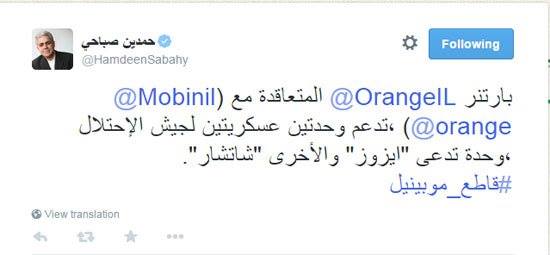 دعا المرشح السابق لرئاسة الجمهورية “حمدين صباحى” لمقاطعة شركة “موبينيل” قائلا “شركة بارتنر المتعاقدة مع “Mobinil” و”orange”، تدعم وحدتين عسكريتين للجيش الإسرائيلى مطلقا هاشتاج “قاطع موبينيل”. وردت الشركة على حمدين فى تغريردة على مواقع التدوينات الصغيرة “تويتر” قائلة “مجموعة اورانج ليس لها اي وجود تشغيلي في إسرائيل و لا يوجد …