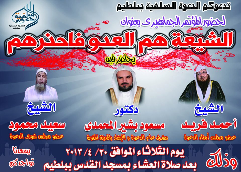 تنظم غداً الثلاثاء الدعوة السلفية ببلطيم مؤتمراً جماهيرياً بعنوان ” الشيعة هم العدو فإحذرهم ” بالتعاون مع حزب النور أمانة البرلس بمسجد القدس ببلطيم . واكد احمد عقبة المنسق الإعلامى لحزب النور بكفرالشيخ ، ان المؤتمر سوف يشهد حضور الشيخ أحمد فريد عضو مجلس أمناء الدعوة ، الشيخ مسعود بشير …