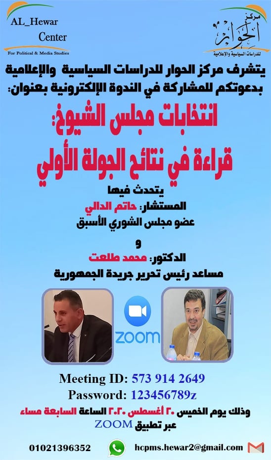 يعقد مركز الحوار للدراسات السياسية والإعلامية ندوة بعنوان “انتخابات مجلس الشيوخ: قراءة في نتائج الجولة الأولى”، وذلك في السابعة مساء الخميس الموافق 20 أغسطس 2020 وذلك عبر تقنية زووم. يتحدث في الندوة المستشار حاتم الدالي عضو مجلس الشورى السابق والدكتور محمد طلعت مساعد رئيس تحرير جريدة الجمهورية. تقوم الندوة بتحليل …