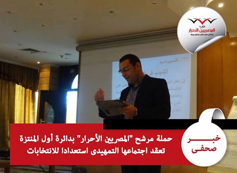 عقدت حملة مرشح حزب المصريين الأحرار، عن دائرة أول المنتزة إبراهيم عبدالوهاب، الأربعاء 25 فبراير، اجتماعها التمهيدي. تناول الاجتماع الاستعداد لإطلاق الحملات الدعائية فور إعلان اللجنة العليا للانتخابات بدء الدعاية الانتخابية للمرشحين في مجلس النواب 2015، والإعداد لتنفيذ برنامج حزب المصريين الأحرار بالدائرة. يذكر أن مرشح المصريين الأحرار، عن دائرة …