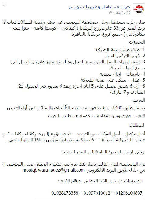 أعلنت أمانة حزب مستقبل وطن بمحافظة السويس عن توفير 100 فرصة من خلال صفحتها على موقع التواصل الاجتماعي ” الفيس بوك ” لأحد فروع الشركات الكبرى بالقاهرة . وأكد عبد الرحمن ناصر ، أمين حزب مستقبل وطن بالسويس ، على العمل على توفير فرص عمل لشباب السويس من اجل الحد …