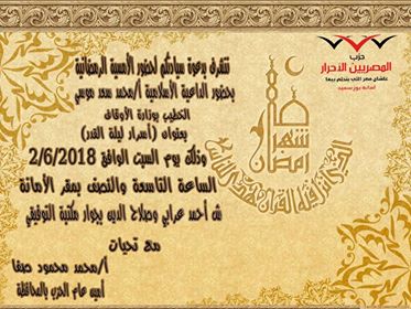 تتوجة امانة حزب المصريين الاحرار ببورسعيد بدعوة لابناء الباسلة لحضور الامسية الرمضانية للداعية محمد سعد موسى ، للحديث عن فضل لليلة القدر ، و ذلك بمقر الحزب شارع احمد عرابي و صلاح الدين خلف حديقه فريال بجوار مكتبه التوفيقى ، حى الشرق