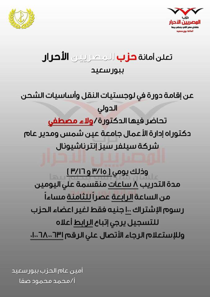 اعلن حزب المصريين ، برعاية الامين العام للحزب ببورسعيد محمد صفا ، عن فتح باب التسجيل لدورة لوجيستيات النقل و الشحن الدولى ، للدكتورة ولاء مصطفى . و قد اعلنت امانه بورسعيد على صفحتها رابط التسجيل ، على ان ينتهى موعد التسجيل فى موعد اقصاه ال 13 من الشهر الجارى …