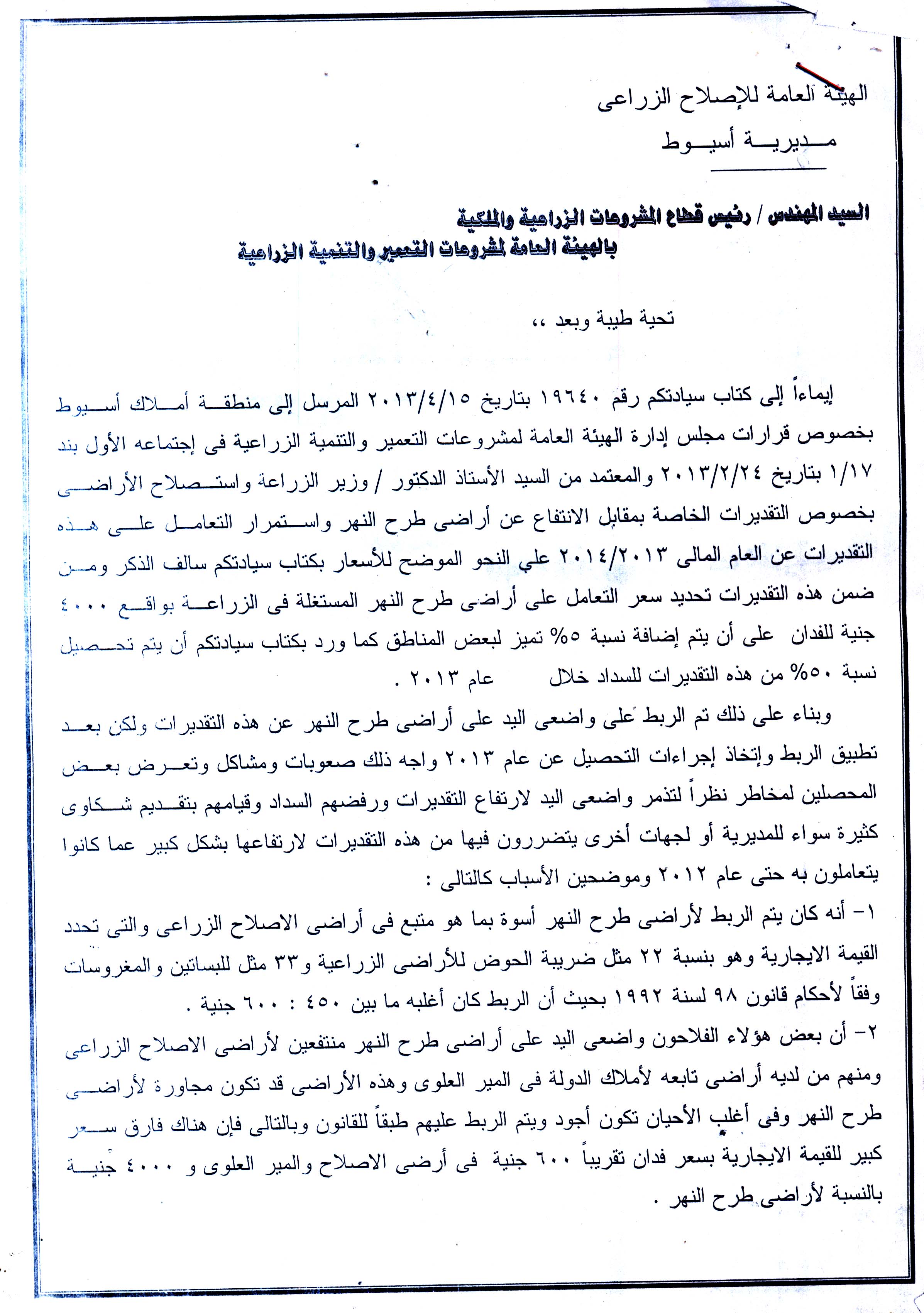 طالب عقيل اسماعيل عقيل سكرتير عام مساعد الحزب باسيوط الرئيس السيسى بالتدخل شخصيا لانقاذ فلاحى مصر – كما انقذ مصر كلها – من قيمة الايجارات الباهظة التى فرضتها حكومة الاخوان برئاسة هشام قنديل( بند 17/1بتاريخ 24/2/2013 معتمد من وزير الزراعة بموافقة مجلس الوزراء ) حتى وصل الفدان فى طرح النهر …