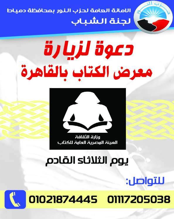 دعت لجنة الشباب داخل الأمانة العامة لحزب النور بدمياط أهالي المحافظة إلي زيارة معرض الكتاب في القاهرة , وذلك يوم الثلاثاء القادم , يأتي ذلك في اطار الفاعليات التي يقوم بها الحزب داخل المحافظة