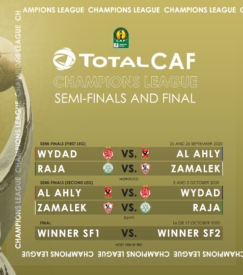 أعلن الاتحاد الإفريقي لكرة القدم “كاف”، إقامة مباراتي الذهاب للدور نصف النهائي لبطولة دوري أبطال إفريقيا في المغرب يومي ٢٥ و٢٦ سبتمبر المقبل، على أن تستضيف مصر مباراتي الإياب يومي ٢ و٣ أكتوبر المقبل. ويلعب في الدور نصف النهائي لدوري الأبطال الإفريقي، الأهلي مع الوداد المغربي، والزمالك مع الرجاء المغربي. …