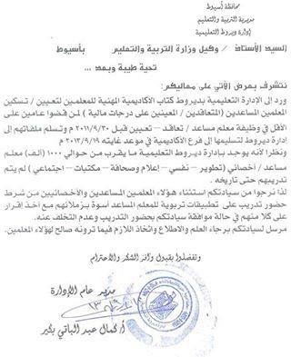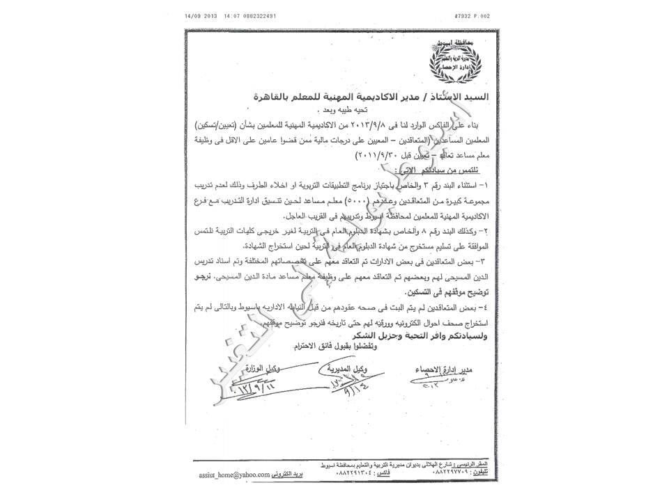 تقدم العديد من المعلمين و الإخصائيين المتعاقدين من دفعات يوليو وسبتمبر بمذكرة للسيد وكيل وزارة التربية والتعليم بأسيوط ، مطالبين فيها بإستثناء البند الثالث الخاص بالتطبيقات التربوية لحين عقد التدريبات التى تقوم بها الإدارات التعليمية بأسيوط إسواة بالقرار الذى صدر لمعلمى المنيا . جاء فى المذكرة التى تقدم بها المعلمين …