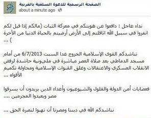 أطلق قيادات الدعوة السلفية بمحافظة الغربية الدعوة العامة إلى أنصارهم ومؤيديهم عبر موقع التواصل الإجتماعي فس بوك موجهه رساله تحت عنوان نداء عاجل تناشدكم القوى الاسلامية الخروج السبت من امام مسجد الدماطى بعد صلاة العصر مباشرة فى مليونية لرفض الانقلاب العسكرى والاعتقلات وغلق القنوات الاسلامية. وأعلنت الدعوة السلفية وأبناءها من حزب الوطن ومحاولة …