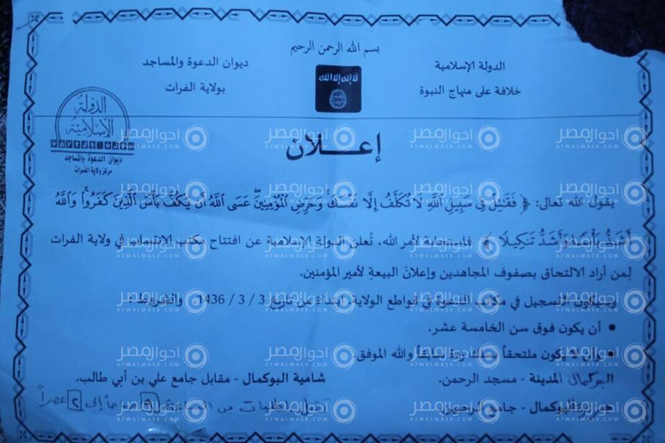 وزع “ديوان الدعوة والمساجد بولاية الفرات” التابع لتنظيم “الدولة الإسلامية في “ولاية الفرات” التي تضم مدينة البوكمال السورية والقائم العراقية وقرى وبلدات بريفيهما، منشوراً وصل إلى المرصد السوري لحقوق الإنسان نسخة منه، أعلنت في عن:: “” افتتاح مكتب الانتساب في ولاية الفرات لمن أراد الالتحاق في صفوف المجاهدين وإعلان البيعة …