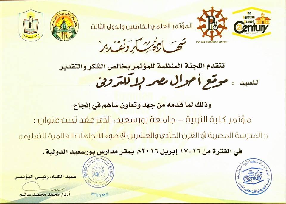 قام الدكتور محمد سالم عميد كلية التربية بجامعة بورسعيد. بتكريم موقع “أحوال مصر”, ومنحه شهادة تقدير, وذلك للتغطية الصحفية المميزة التي قام بها الموقع خلال مؤتمر الكلية العلمي الخامس والدولي الثالث الذي أقيم تحت عنوان ” المدرسة المصرية في القرن الواحد والعشرين ” . وقد قام الدكتور محمد سالم عميد …
