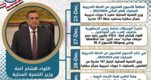 أصدر المركز الإعلامي التابع لوزارة التنمية المحلية، “الانفوجراف الأسبوعي” في نسخته الـ ٦٧ حول حصاد أهم الأنشطة والفعاليات التي قام بها اللواء هشام آمنة وزير التنمية المحلية، خلال الأسبوع الماضي في الفترة من ٢٣ وحتى ٢٩ ديسمبر الجاري، حيث نستعرض أبرزها في التقرير التالي الذي نشرته الصفحة الرسمية لوزارة التنمية …