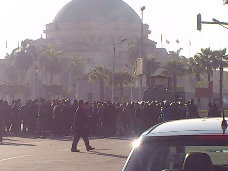 تجدد الاشتباكات الآن من داخل الباب الرئيسي لجامعة القاهرة بعد سيطرة مجموعة كبيرة من الطلبة المتظاهرين وإطلاقهم لأعيرة من الخرطوش وإشعال النار داخل الحرم الجامعي