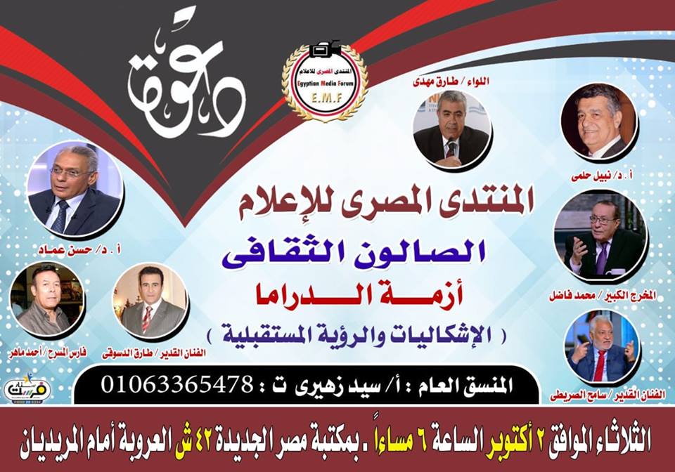 أعلن المنتدي المصري للاعلام, برئاسة اللواء طارق مهدي, عدد من التوصيات التي طالب بها نجوم الفن وخبراء الاعلام, لانقاذ “الدراما المصرية”, حيث شدد الجميع علي ضؤورة عودة الانتاج الضخم للأعمال الدرامية. جاء ذلك خلال فعاليات الصالون الثقافي لـ”المنتدى المصري للاعلام”, والذي أقيم مساء الثلاثاء الماضي بمسرح مكتبة مصر الجديدة, بحضور …